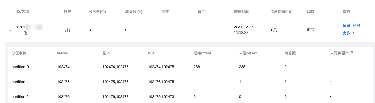 在 Topic 列表页,单击 Topic 名称左侧右三角符号,可以查看到 Topic 分区状态和详情。