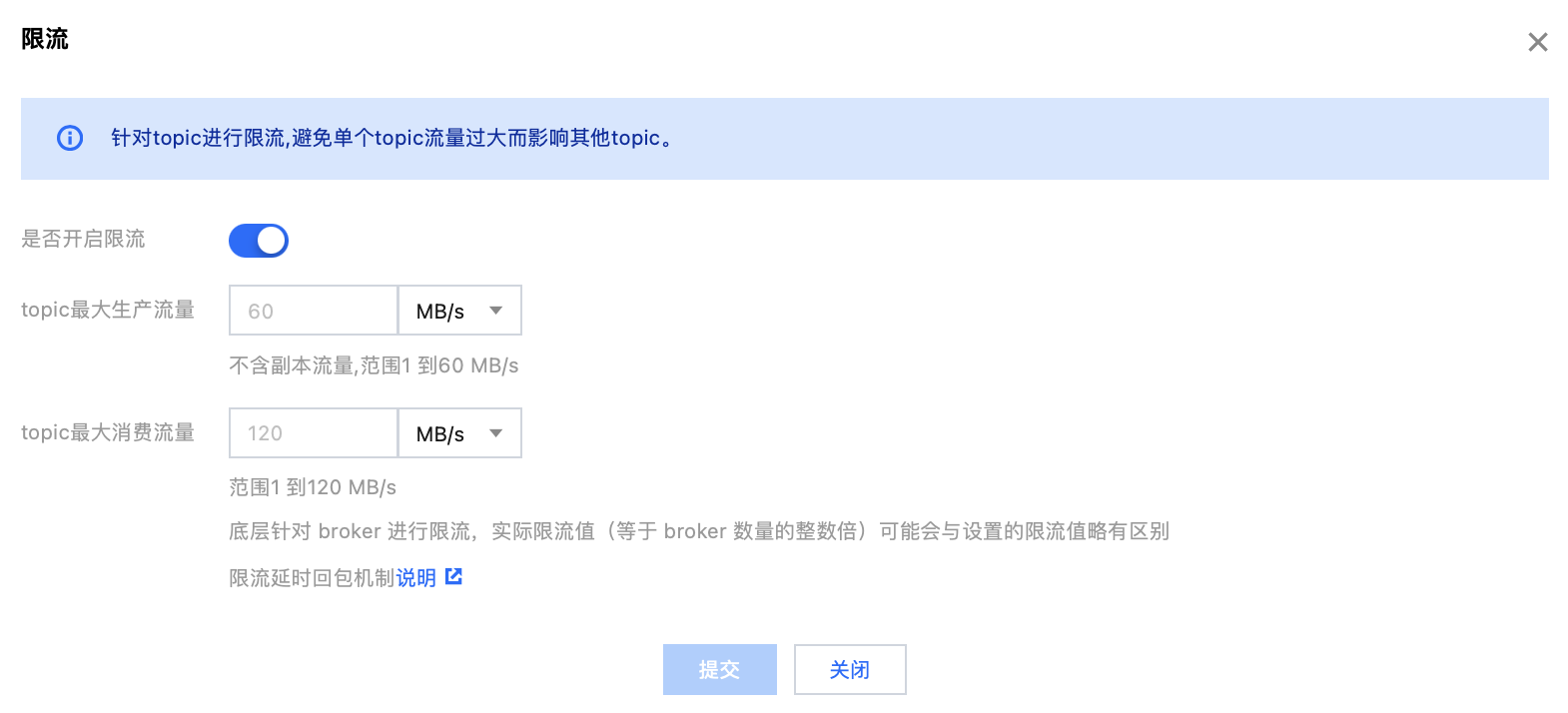 topic 最大消费流量:取值范围为 1MB/s 到该实例购买的最大带宽。底层针对 broker 进行限流,实际限流值(等于 broker 数量的整数倍)可能会与设置的限流值略有区别。关于软限流机制说明请参见 限流机制说明。 CKafka 限流实践教程