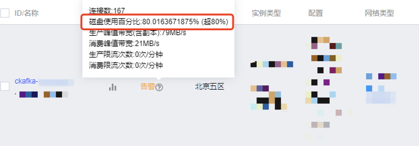 1. 在实例列表上,每个集群都有对应的健康度展示。当健康度显示为“告警”字样时,可以将鼠标移至其上查看弹出的详细数据。这个数据会展示当前用户的峰值流量以及发生限流的次数,用户可以根据这里的数据判断该实例是否发生过限流。