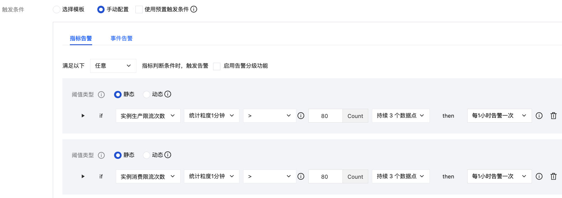 当实例出现限流次数,同时观察高级监控,每个节点都持续出现限流,实例的流量低于规格值 10% 以上,且排除 Topic 限流规则的影响,此种情况不符合预期,针对这类问题提工单支持。