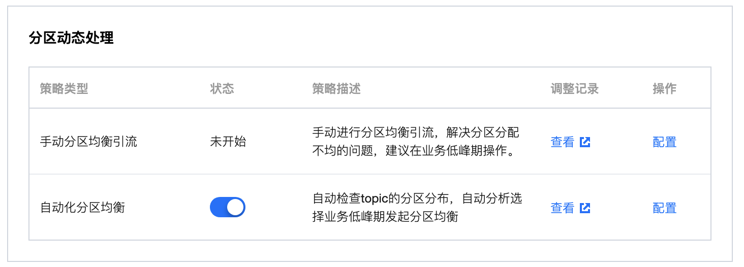 4. 在弹性伸缩页面的分区动态处理模块,单击操作栏的配置,配置手动分区均衡引流。