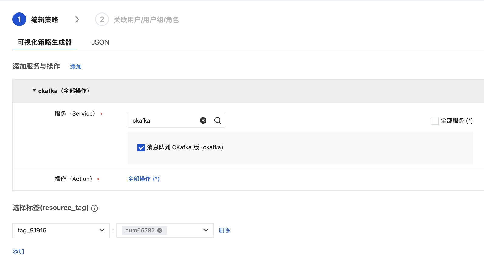 3. 在可视化策略生成器中,在服务(Service)中输入 Ckafka 进行筛选,在结果中选择消息服务(ckafka),在操作中选择全部操作(*),您也可以根据需要选择相应的操作。