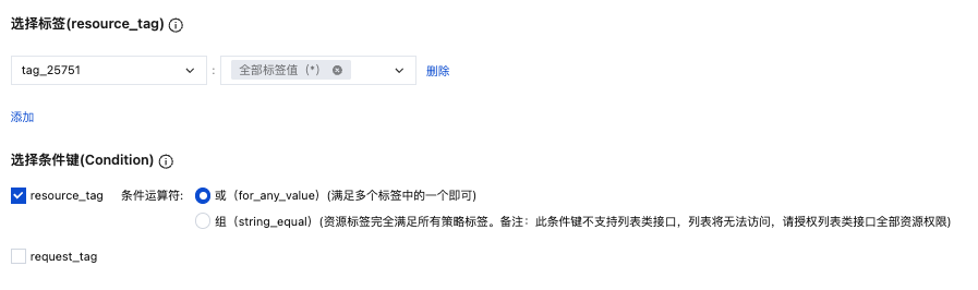 5. 在选择条件键位置,选择好条件键。条件键 resource_tag、request_tag 可多选,也可只选择其中一个。