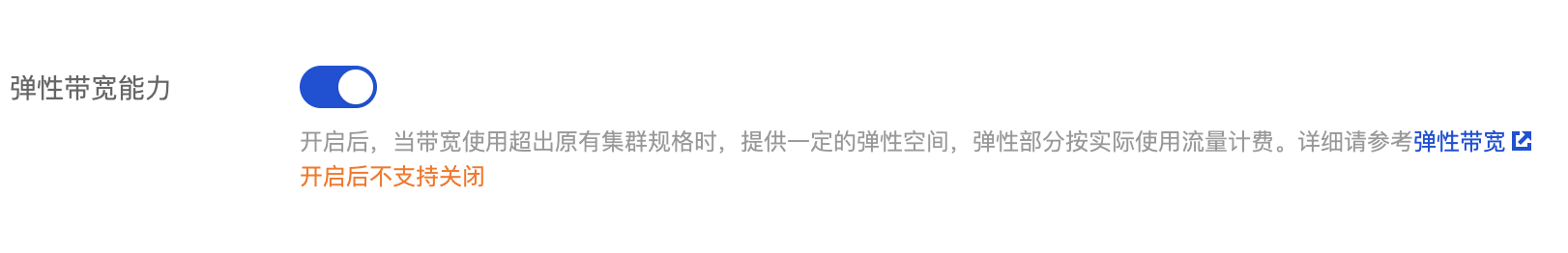 弹性带宽适合业务侧偶尔出现的突发流量场景,超出实例规格的部分按需使用按量计费,且可增加的增量部分有一定上限。若业务流量绝大部分时间都超出实例规格,建议通过当前已有的升降配能力快速扩缩容。具体操作请参考变更实例规格。 约束与限制