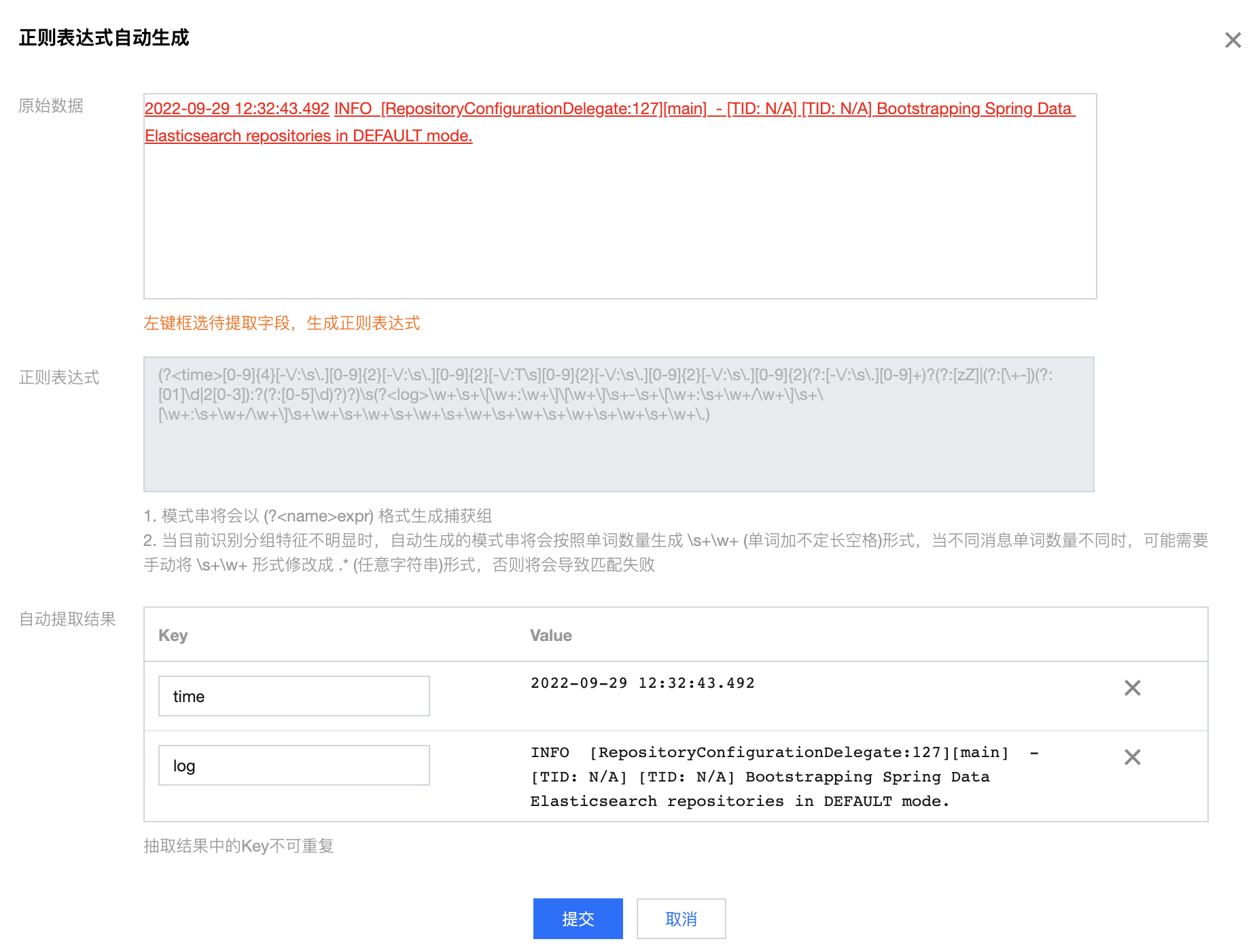 {"time":"2022-09-29 12:32:43.492","log":"INFO [RepositoryConfigurationDelegate:127][main] - [TID: N/A] [TID: N/A] Bootstrapping Spring Data Elasticsearch repositories in DEFAULT mode."}