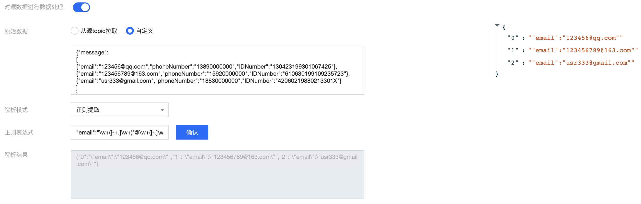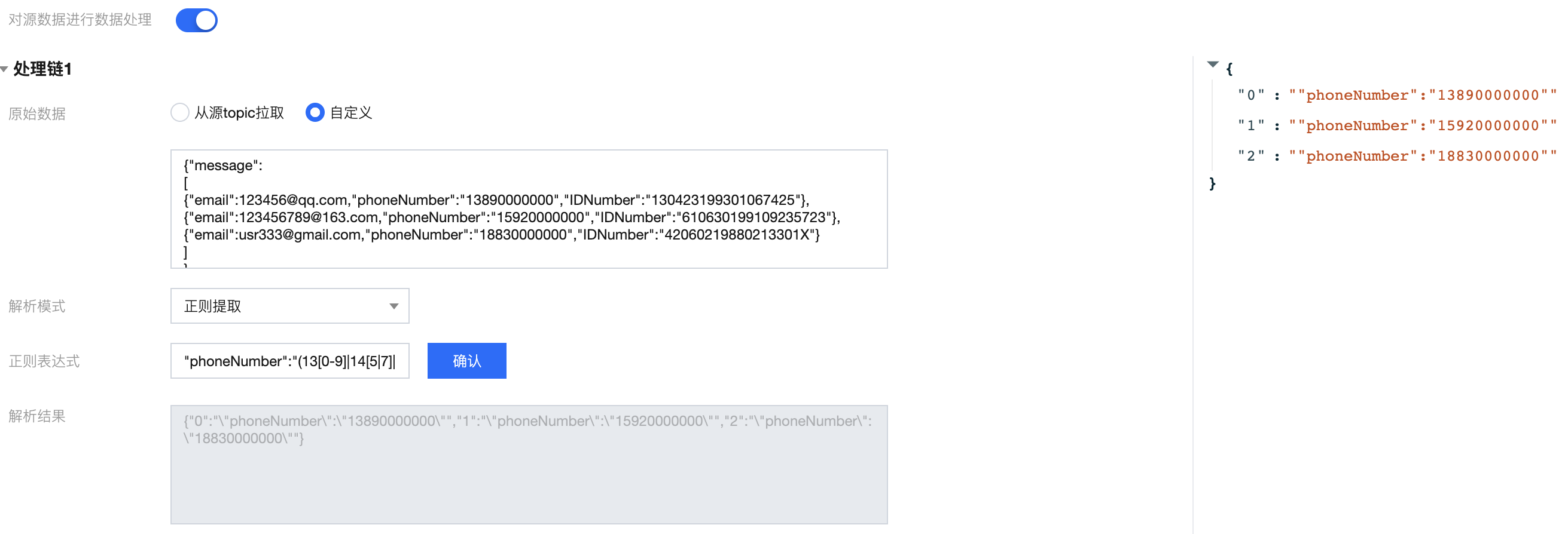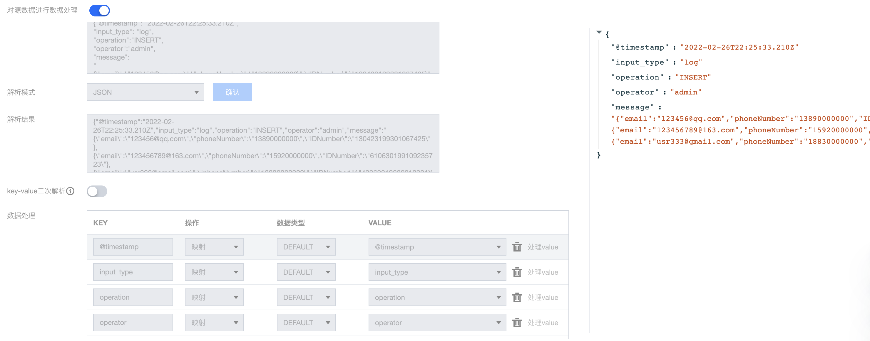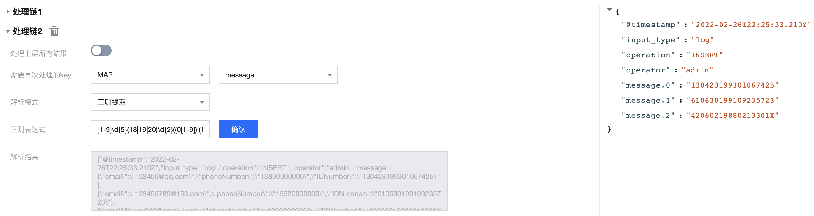 {"@timestamp": "2022-02-26T22:25:33.210Z","input_type": "log","operation": "INSERT","operator": "admin","message": "{\\"email\\":\\"123456@qq.com\\",\\"phoneNumber\\":\\"13890000000\\",\\"IDNumber\\":\\"130423199301067425\\"},{\\"email\\":\\"123456789@163.com\\",\\"phoneNumber\\":\\"15920000000\\",\\"IDNumber\\":\\"610630199109235723\\"},{\\"email\\":\\"usr333@gmail.com\\",\\"phoneNumber\\":\\"18830000000\\",\\"IDNumber\\":\\"42060219880213301X\\"}"}