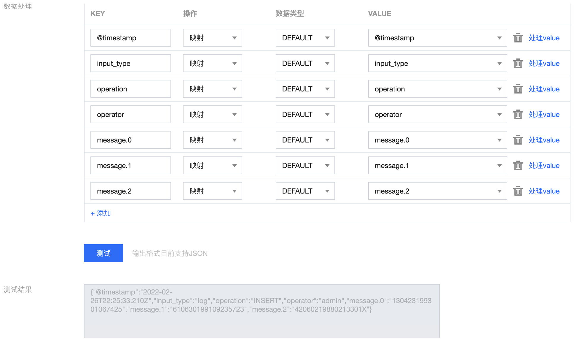 {"@timestamp": "2022-02-26T22:25:33.210Z","input_type": "log","operation": "INSERT","operator": "admin","message.0": "130423199301067425","message.1": "610630199109235723","message.2": "42060219880213301X"}
