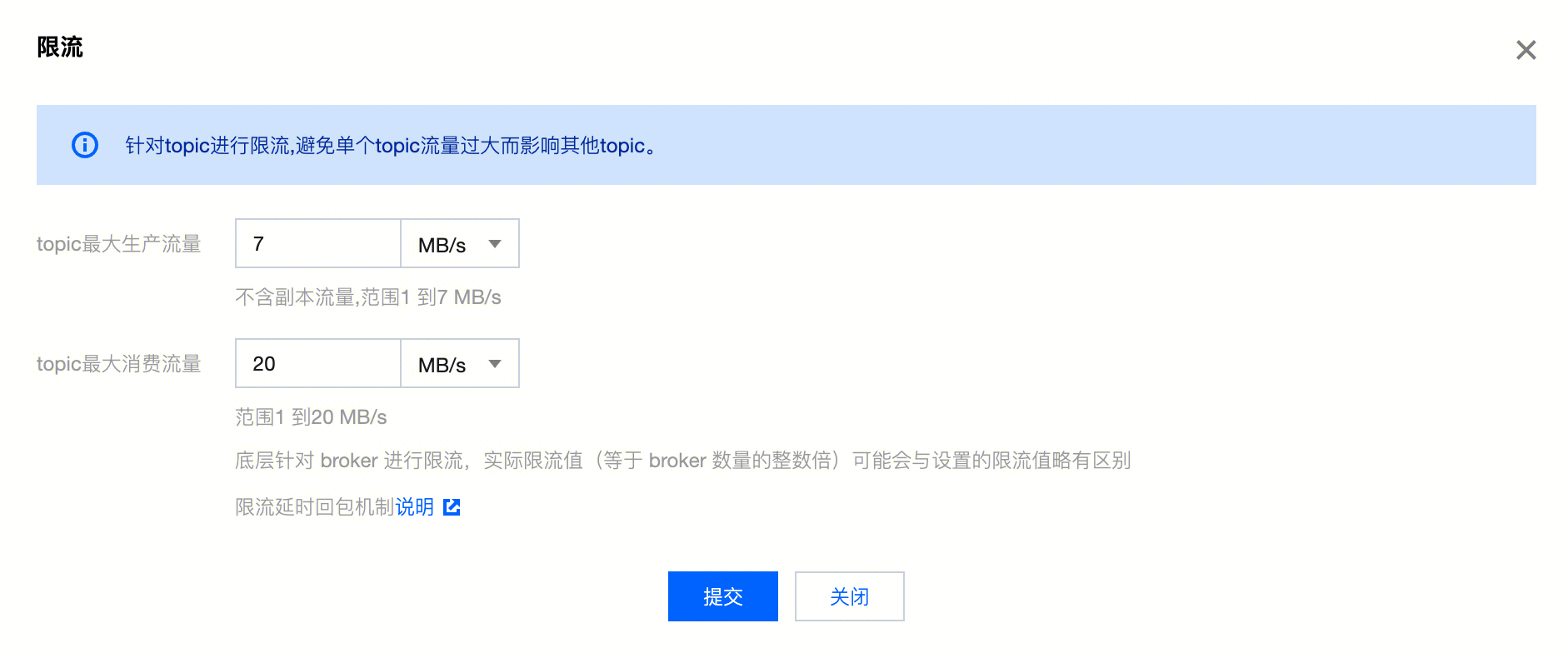 客户可以配置 Topic 的限流,例如配置 Topic:Test,2 副本,写入限流 7MB/s(已计算副本),消费限流 20MB/s。