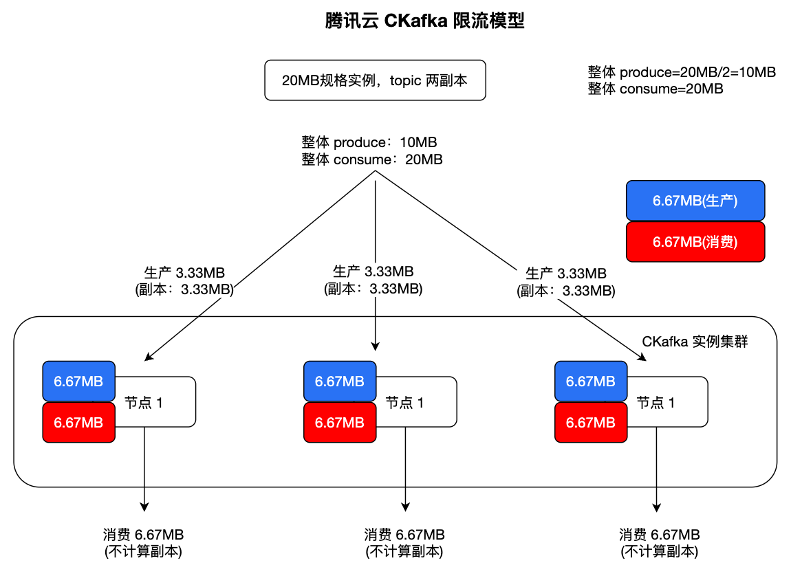 CKafka 针对客户使用场景和需求,至少为 3 节点部署,因此 20MB 的流量,设计为每个节点承受 6.67MB 的读和写流量,因此在使用上建议您设置的分区数尽量为节点的 2-3 倍,使请求流量均衡,方能发挥最大效能。