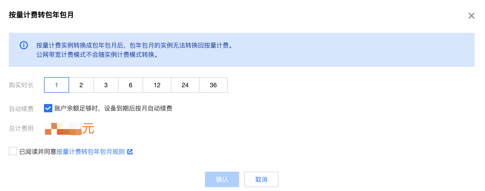 4. 勾选已阅读并同意按量计费转包年包月规则,单击确认,在订单支付页面完成支付,完成转换操作。