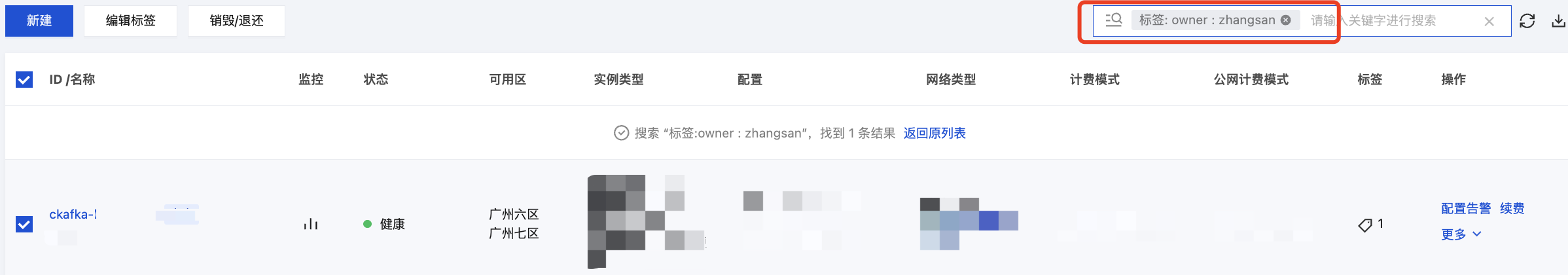 标签:后弹出的窗口中选择您要搜索的标签,单击确定进行搜索。例如:选择 标签:owner:zhangsan 可筛选出绑定了标签键 owner:zhangsan 的集群。