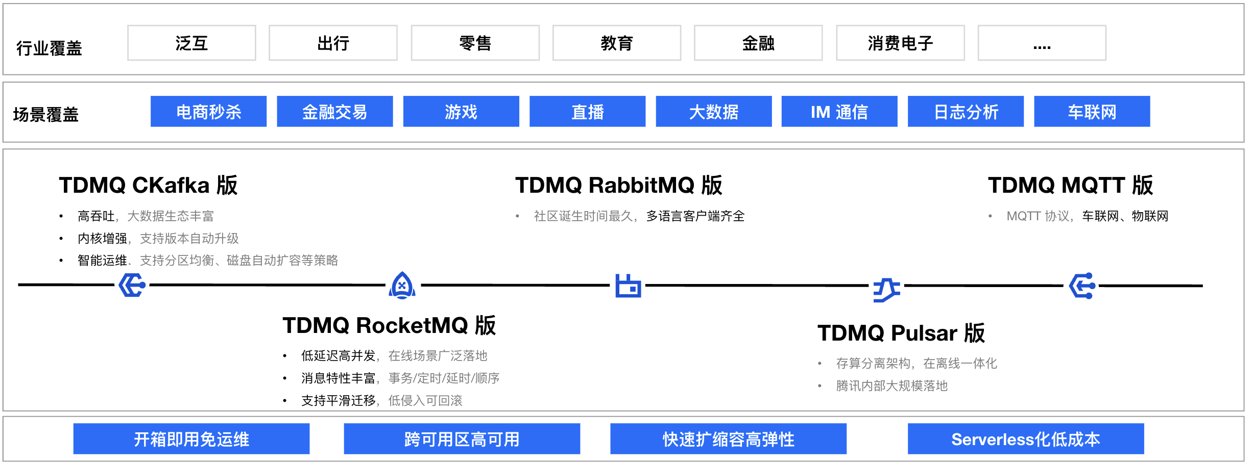 面向不同客户的场景和需求,TDMQ 都可以提供最合适的产品形态和方案。如有任何需求,可以联系我们进行咨询。 |