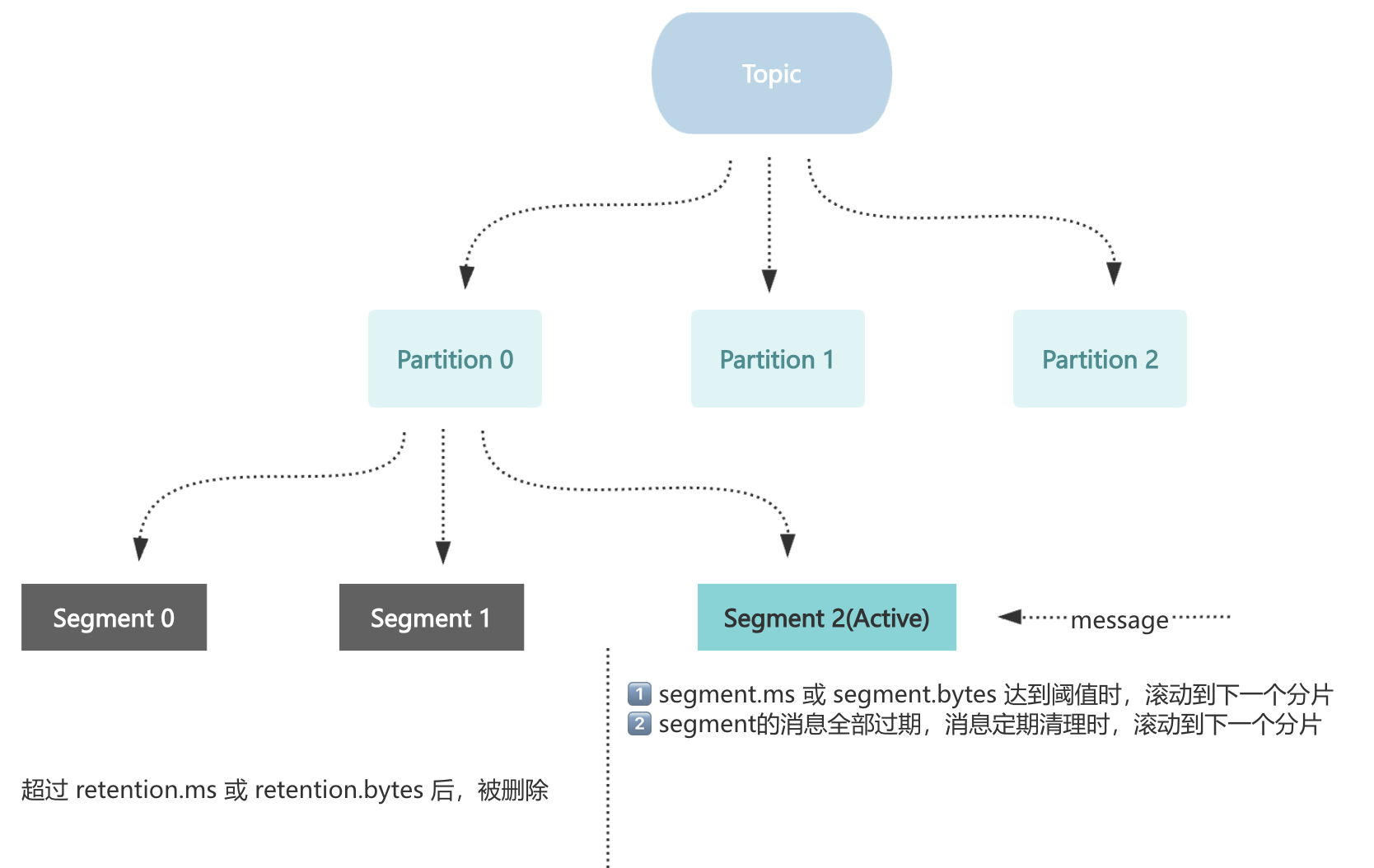Kafka 以分片为单位删除文件,而非逐条删除消息。若某消息在活跃分片内,即使超时也不会被删除。