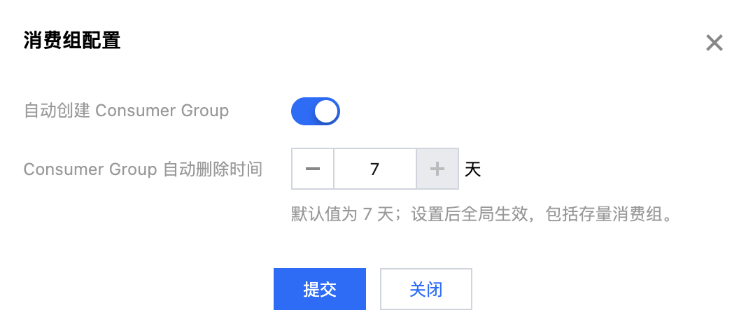 Consumer Group 自动删除时间:默认7天,时间范围为1-7天。