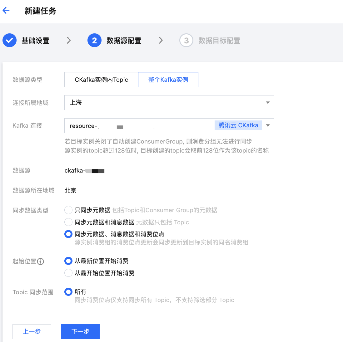 起始位置 | 若选择了同步元数据和消息数据或者同步元数据、消息数据和消费位点,需要配置 Topic offset(偏移量),用于设置转储时对历史消息的处理策略。支持两种方式: 从最新位置开始消费:即最大偏移量,从当前最新的数据开始消费(跳过历史消息)。 从最开始位置开始消费:即最小偏移量,从最早的数据开始消费(同步全部历史消息)。 |