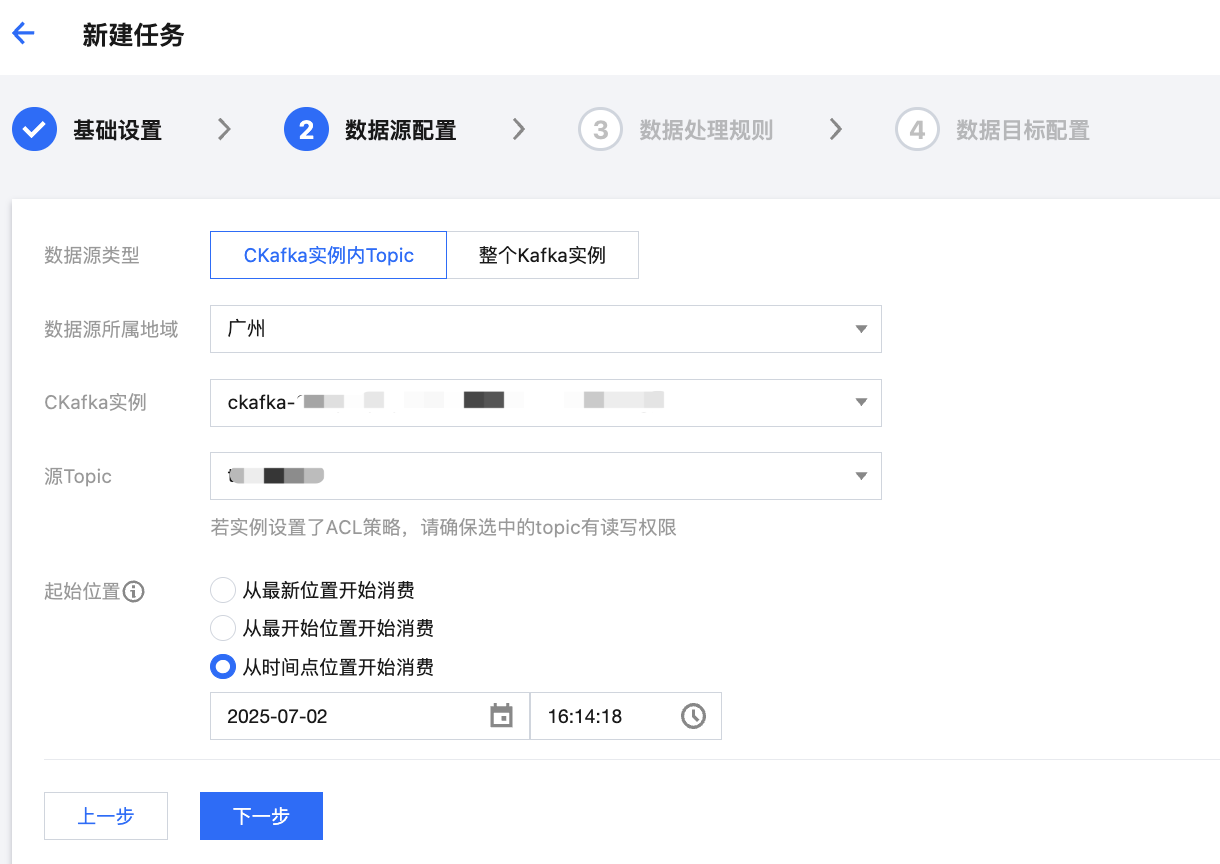 源 Topic | 在下拉列表中,选择已准备好的数据源 Topic。 若数据源实例设置了 ACL 策略,请确保具备选中的数据源 Topic 的读写权限。 |