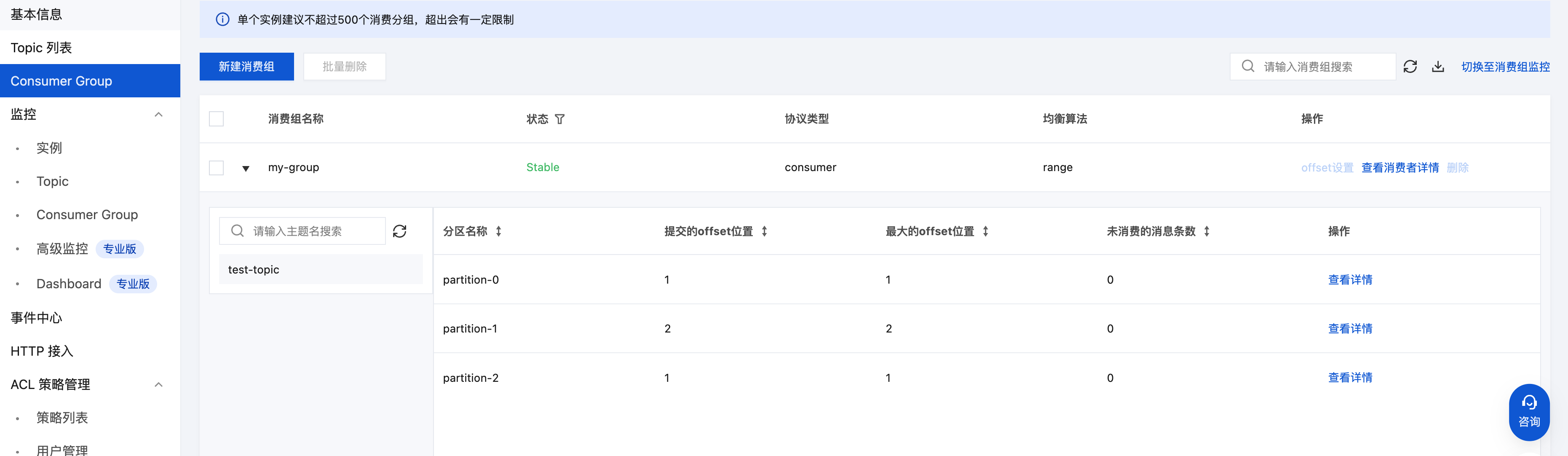 consumerGroupId | 您可以自定义设置,Demo 运行成功后可以在 Consumer Group 页面看到该消费者。 |