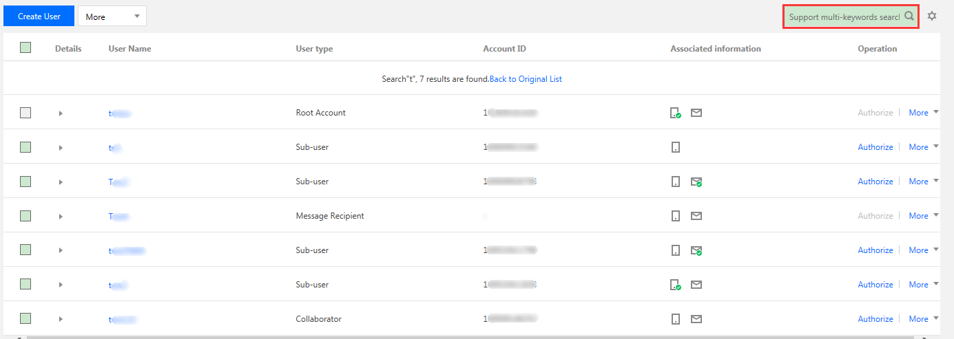 您可以通过用户名、账号 ID、SecretId、手机、邮箱、备注等关键词搜索协作者。