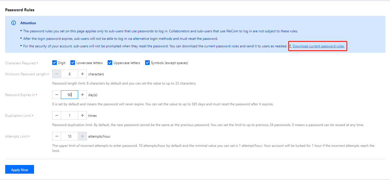 3. 单击应用修改,该密码规则即可生效。您在下次重置密码时需要遵守本次设置的密码规则。
