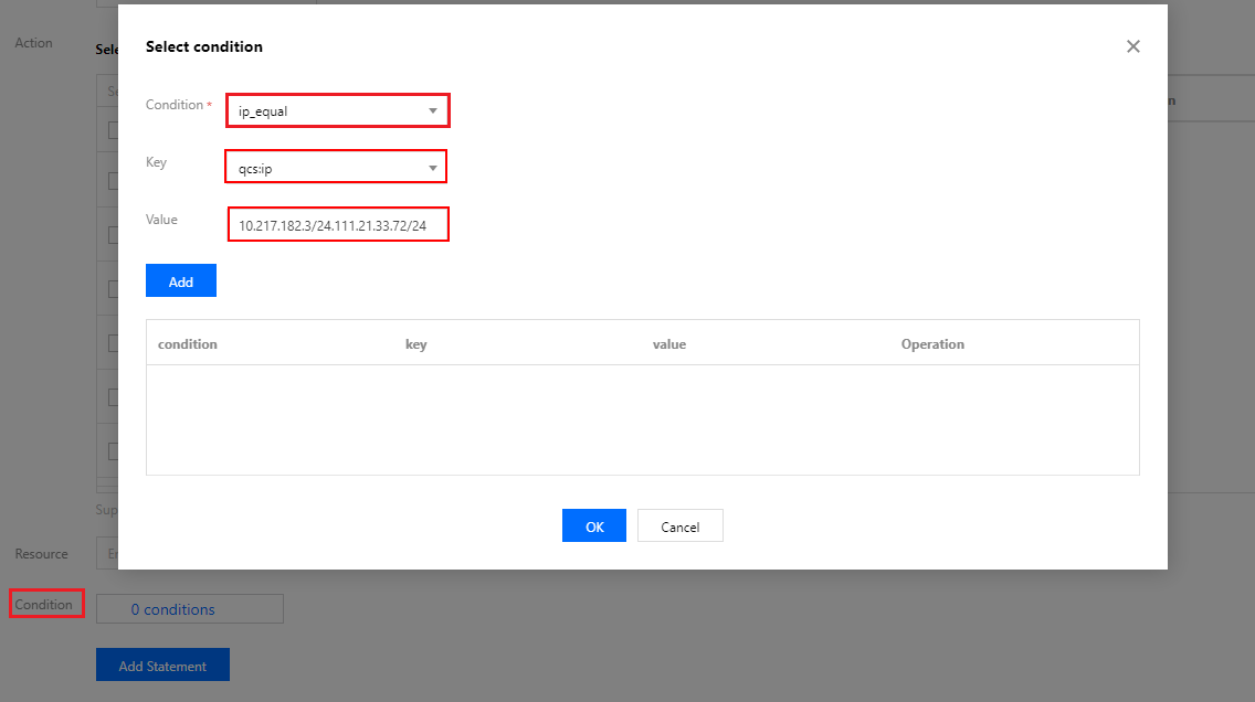 条件:根据您的需求选择条件,输入 IP 地址。可以添加多条限制。例如,效果选择"允许",仅限使用该 IP 地址的用户或组获取授权。