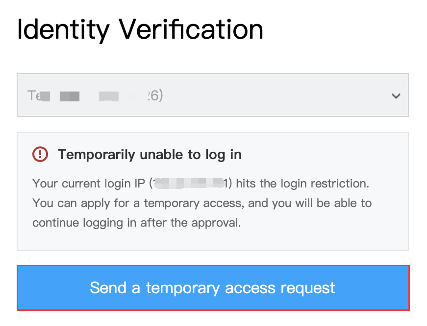 当您的子账号登录命中登录 IP 限制条件时,若 设置登录限制 中允许您申请临时解除限制,则您可以申请临时访问权限,审核人审核通过您的子账号可以获得 2 小时的临时访问控制台权限。 1. 当您的子账号登录命中登录限制条件,提示暂时无法登录时,单击发送临时访问申请,如下图所示: