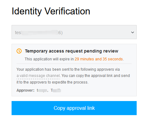 2. 页面弹出临时访问申请等待审批中提示,系统将您本次提交的申请已通过有效消息渠道发送至以下审核人,审核申请单次有效期为 30 分钟,您可以复制审批链接发送至审核人加快处理效率,如下图所示: