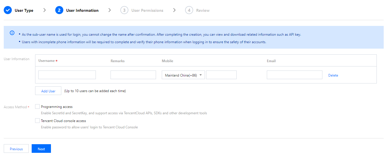 1. 登录腾讯云控制台,进入 用户列表, 单击新建用户,进入新建用户页面。 3. 在新建协作者页面,填写用户信息,完成后单击下一步设置用户权限。