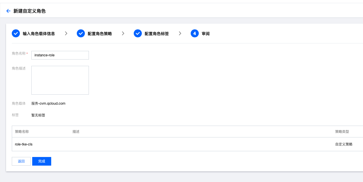 (1)进入腾讯云控制台,访问管理 > 角色 页面。 (2)单击新增角色,创建自定义角色 instance-role。