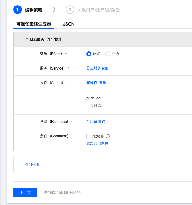 (3)创建允许上传日志的自定义策略(注:可根据场景不同,赋予角色不同的策略)。
