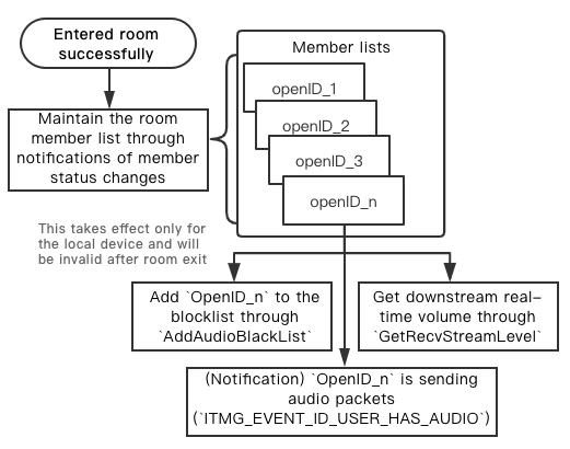 ITMG_EVENT_ID_USER_HAS_AUDIO | 有成员发送音频包,返回此时房间内说话的 openid,通过此事件可以判断用户是否说话,并展示声纹效果 | 应用侧维护通话成员列表 |
