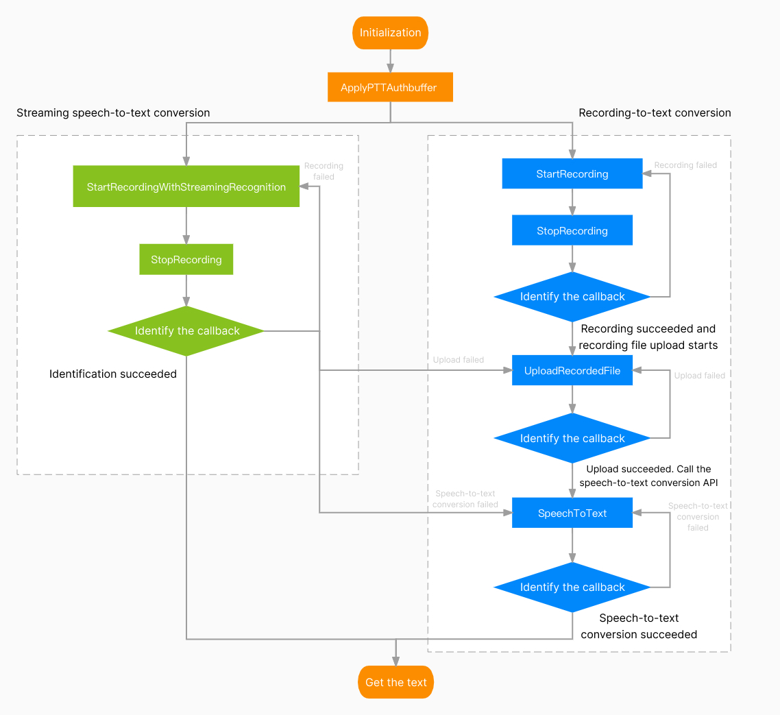 32777 | 流式语音转文本失败,但是录音成功,上传成功 | 返回的信息中有上传成功的后台 url 地址,调用 SpeechToText 接口进行语音转文字操作。 |