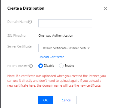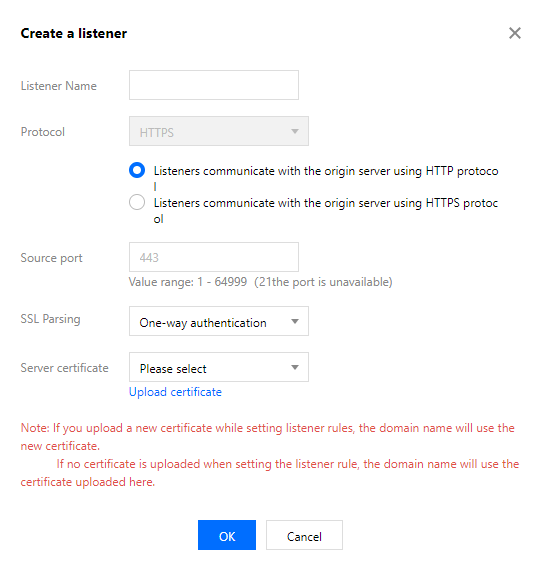 服务器证书:默认使用创建监听器时选择的证书。如您在此处重新上传证书,则该域名将使用新证书进行认证