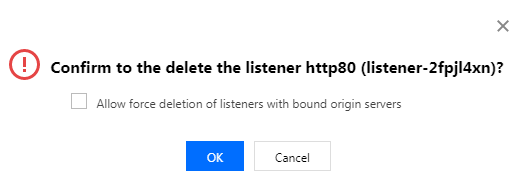 单击 HTTP/HTTPS 监听器管理标签页,在操作栏单击删除,可以删除指定的监听器,若监听器已绑定源站,则需要选中“允许强制删除绑定有源站的监听器”后,才能删除。删除后,该监听器的端口将停止加速。