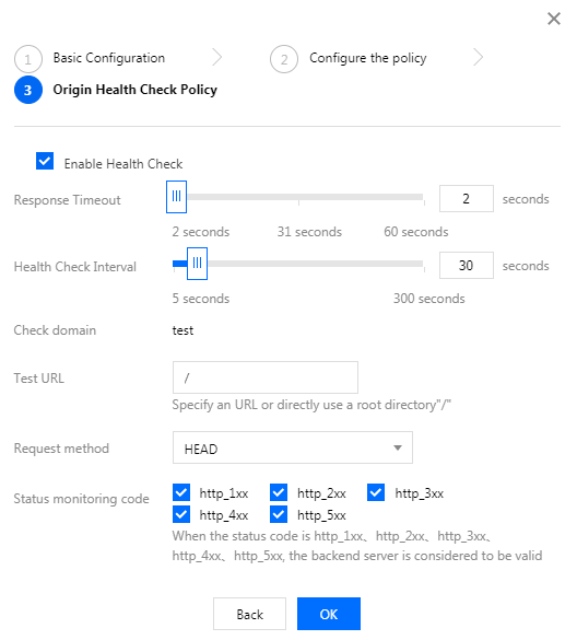 您可以选择针对当前域名启用监控检查机制。可以设置独立的检查 URL,请求方式可以支持HEAD及GET,检查状态码可支持 http_1xx,http_2xx,http_3xx,http_4xx,http_5xx,状态码可单选也可多选,即当检测到指定的状态码时,监听器认为后端源站属于正常状态。如果未检测到任何状态码时,监听器认为后端源站异常。