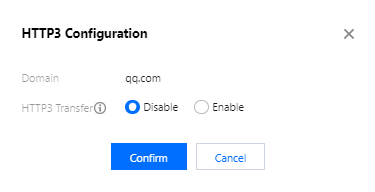 支持变更对应域名是否开启HTTP3传输(当前仅支持在HTTPS监听器配置,且创建通道时HTTP3特性状态为开启)