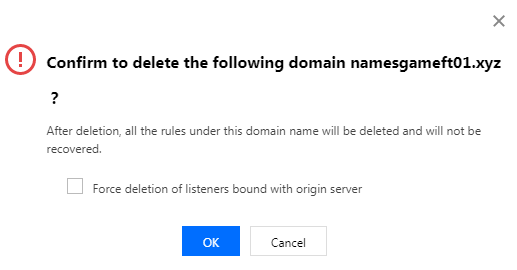完成“添加域名”操作后,单击删除可删除域名。如果域名下已有规则绑定源站,则需要勾选“强制删除绑定有源站的规则”。