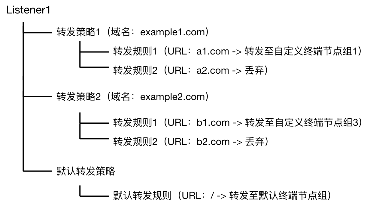 一个监听器下配置了两条自定义转发策略,自定义策略1匹配域名为 example1.com,匹配 URL 为/aaa,转发动作为 转发至自定义终端节点组1;自定义策略2匹配域名为 example2.com,匹配 URL 为/bbb,转发动作为 丢弃;则该监听器匹配流程如下: