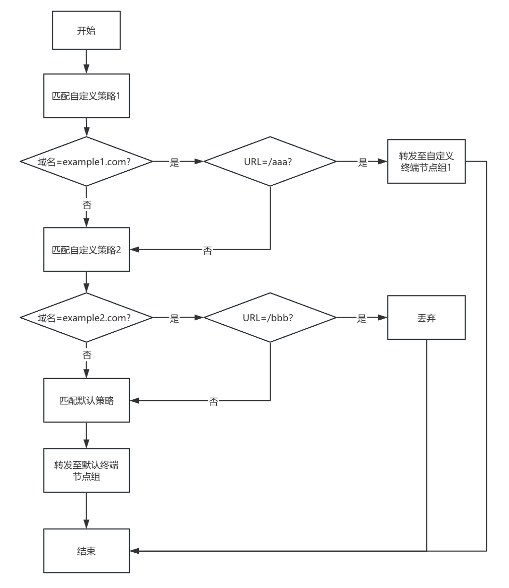 匹配失败:继续匹配其余的自定义策略,如未匹配上任何自定义策略,最终按默认策略动作执行,将请求发送至默认终端节点组。