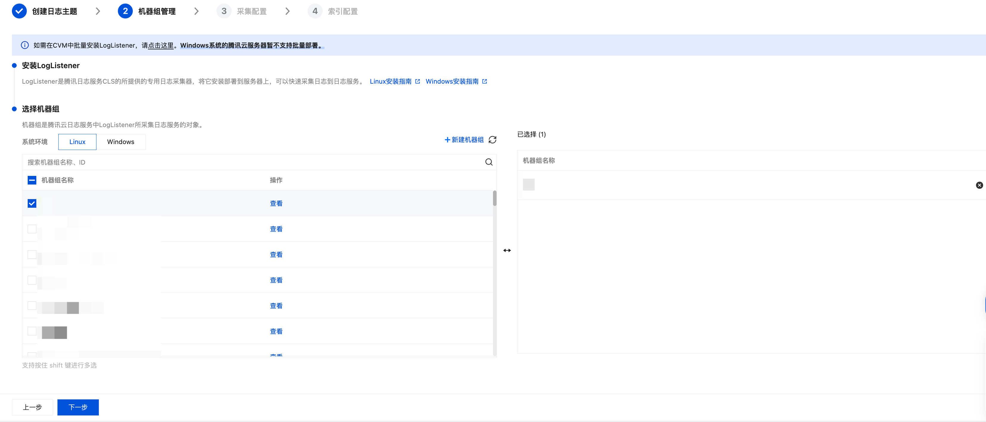在机器组管理页面,勾选需要与当前日志主题进行绑定的机器组,单击下一步,即可进入采集配置阶段,更多详情请参见 管理机器组。 步骤3:Syslog 采集配置
