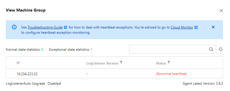 配置机器组时,可能会出现所安装的 LogListener 状态异常。一旦状态异常,则 LogListener 与日志服务后端连接中断,会导致 LogListener 无法正常上传日志,异常状态如图: