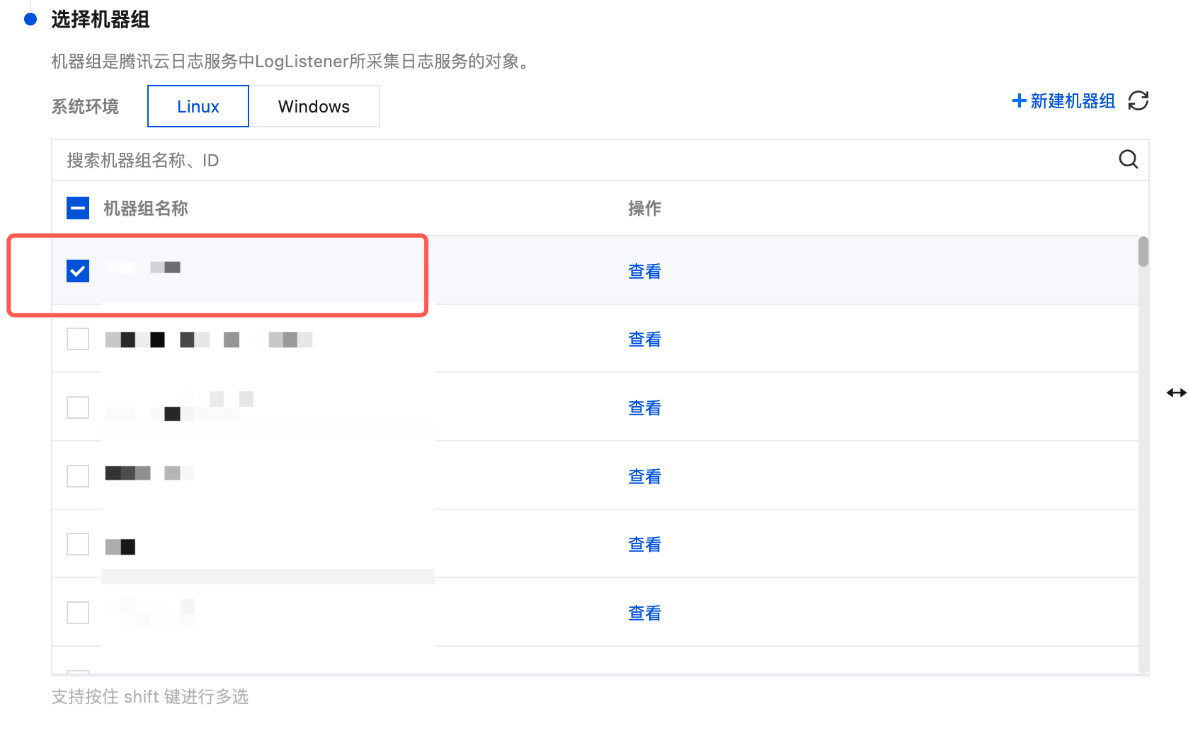 2. 填写机器组名称,通过机器标识的方式关联已安装 LogListener 的目标服务器。详情请参见 机器组,然后单击确定。 3. 完成创建后,在 Tab 选项中选择您创建的机器组的系统环境,在列表中勾选您的目标机器组,并单击下一步。
