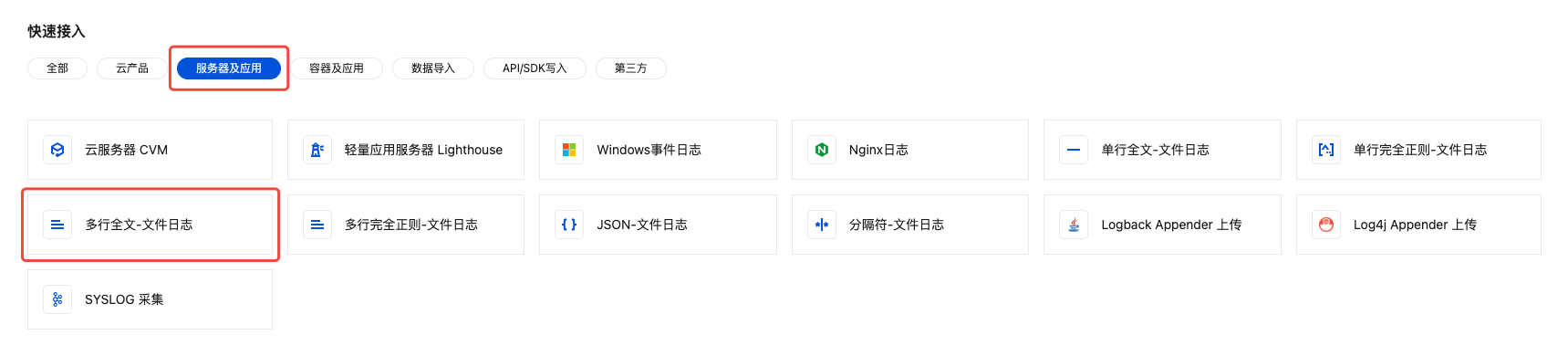 3. 在快速接入中,选择服务器及应用,并单击多行全文-文件日志,进入采集配置流程。