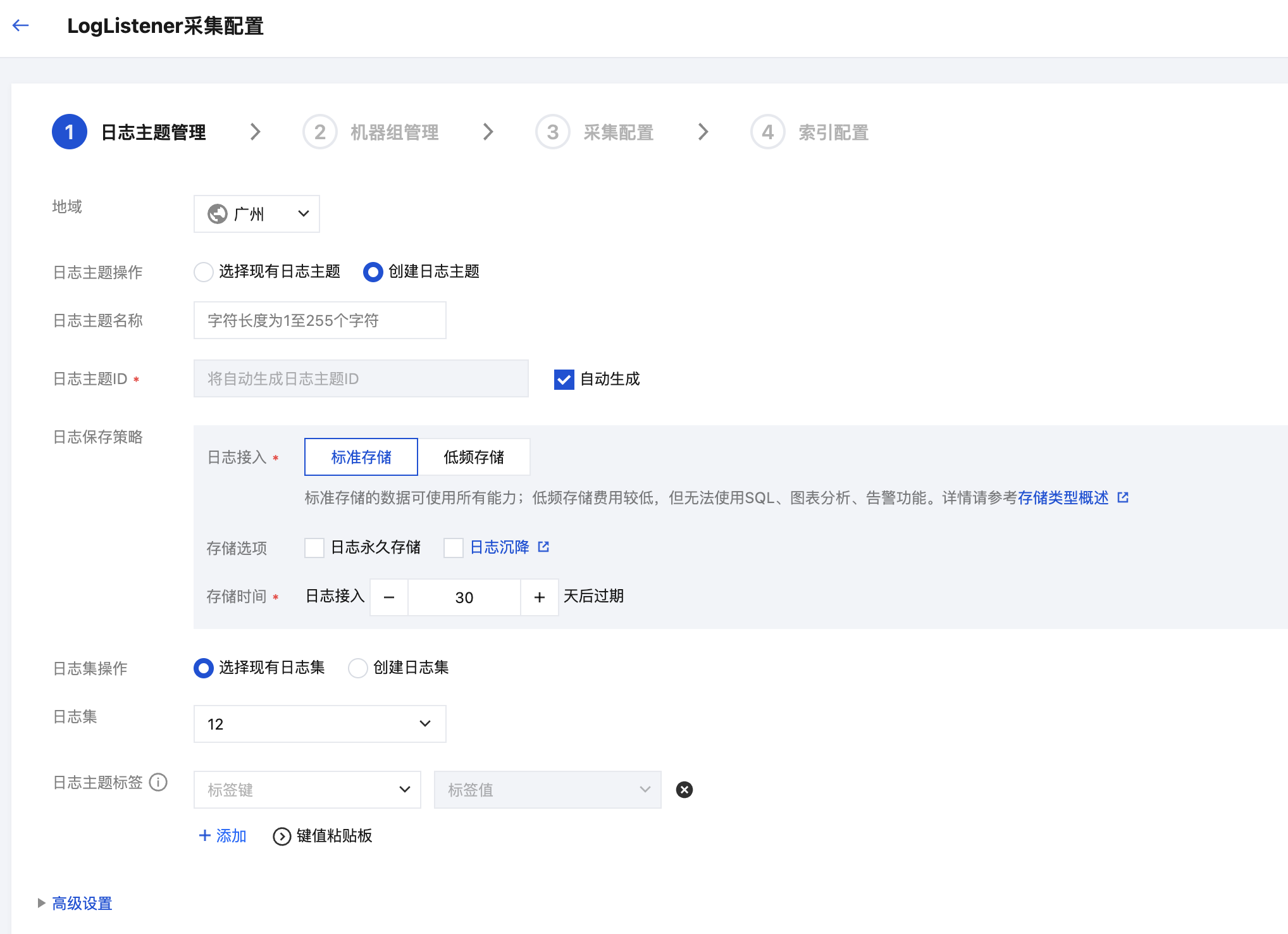 4. 在采集配置流程的创建日志主题页面,根据实际需求,输入日志主题名称,配置日志保存时间等信息,单击下一步。