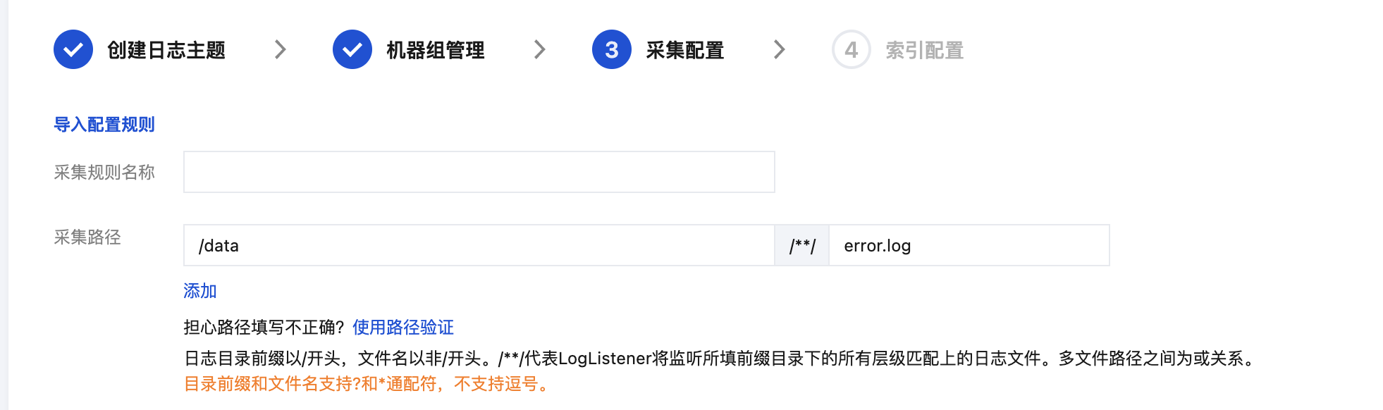 在采集配置页面,填写采集规则名称,并根据日志采集路径格式填写“采集路径”。日志采集路径格式参考如下: