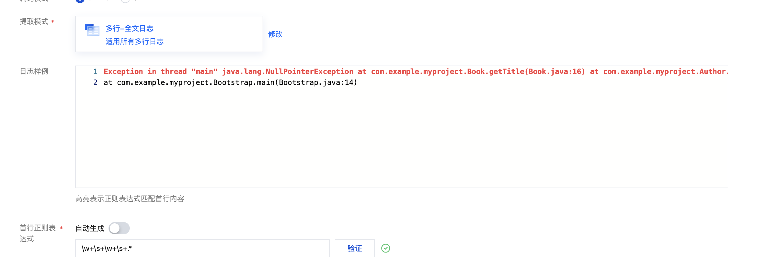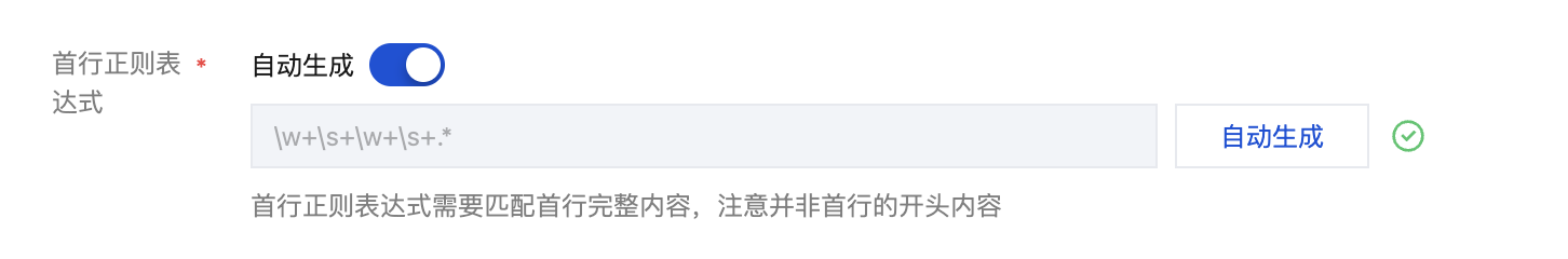 您可选择自动生成或者手动输入两种方式定义首行正则表达式,系统会根据样例内容进行正则表达式的验证。