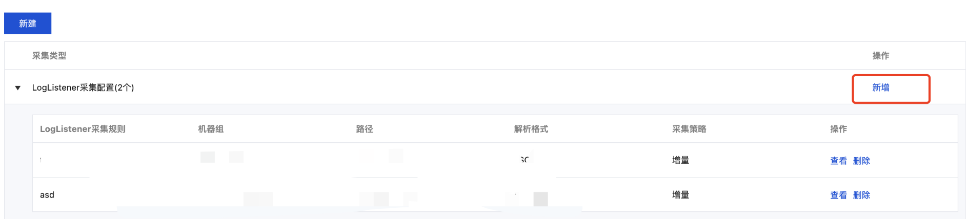 3. 选择采集配置页签,在 LogListener 采集配置栏下单击新增,进入日志数据源选择。