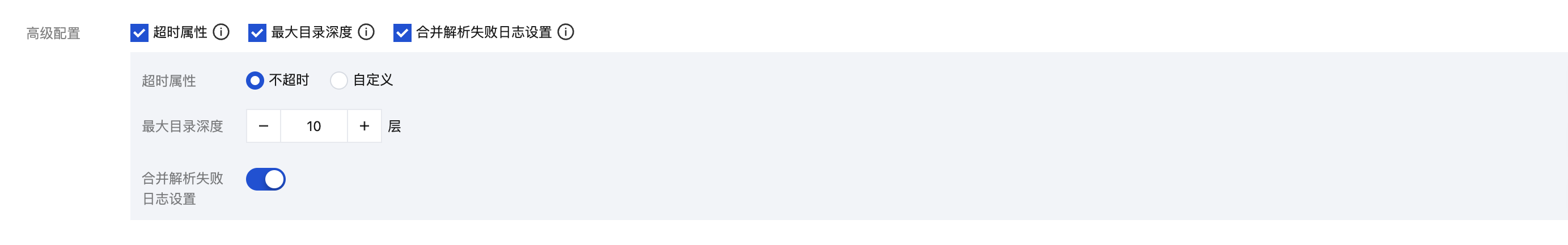 开启后需要配置解析失败的 Key 值(默认为 LogParseFailure),所有解析失败的日志,均以输入内容作为键名称(Key),原始日志内容作为值(Value)进行上传。 高级配置