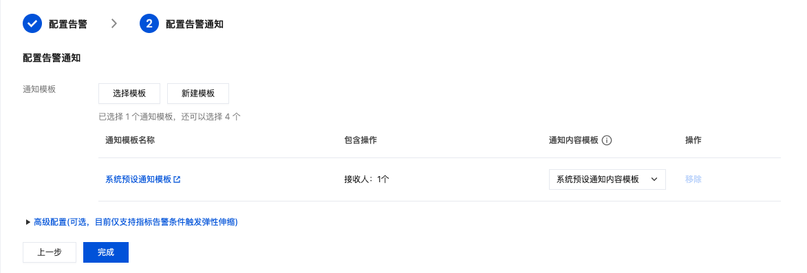 您可选择或新建通知模板用于接收告警信息,新建模板可参考 新建通知模板。 注意: