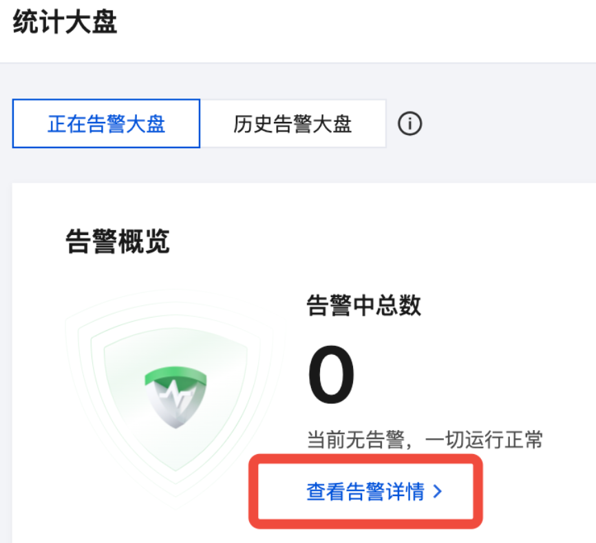 2. 在左侧菜单栏中选择告警管理 > 统计大盘,可以查看告警大盘。在查看告警详情中可以查看触发告警的历史信息,包括告警触发的开始时间、持续时间等详情。