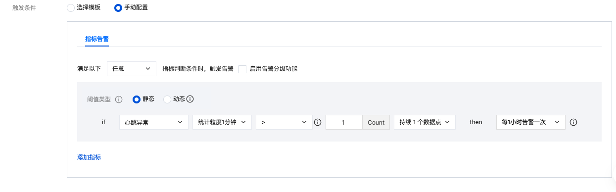 日志服务会将机器组的心跳异常/正常数量上报腾讯云可观测平台。在选择监控类型和策略类型后,系统将自动设置对应云产品的告警策略常用触发条件。您也可以自定义配置指标告警,配置说明如下: